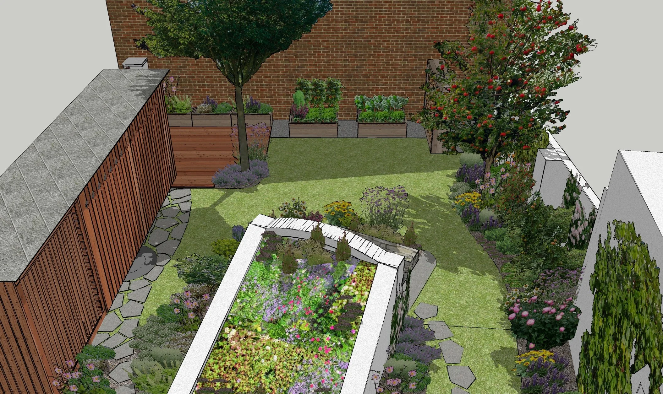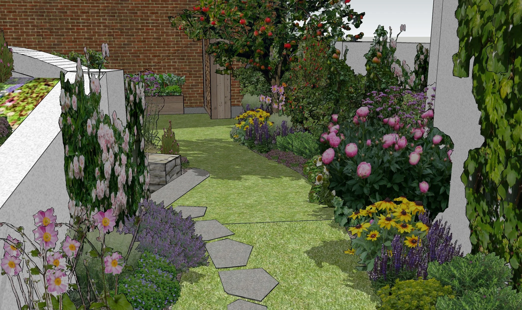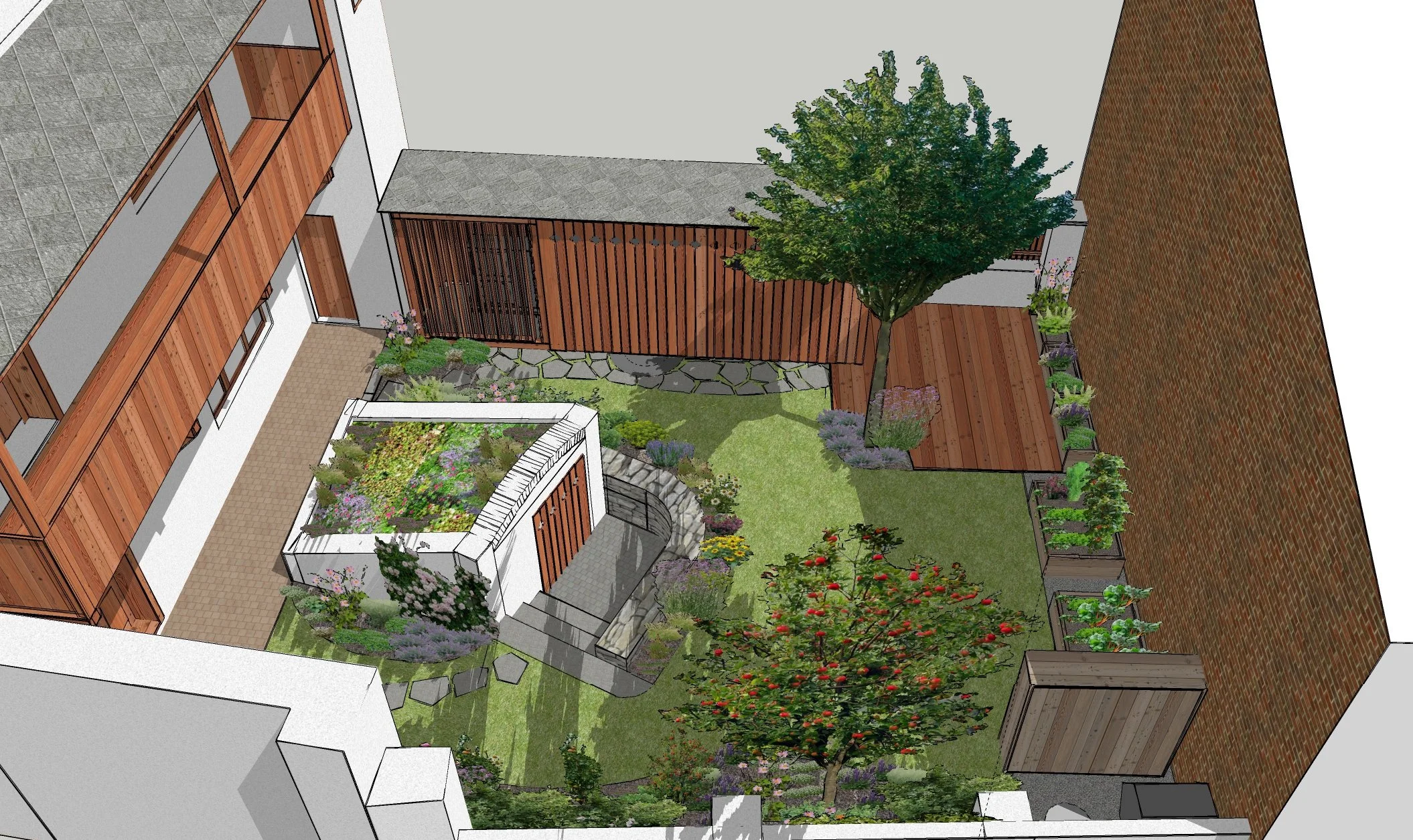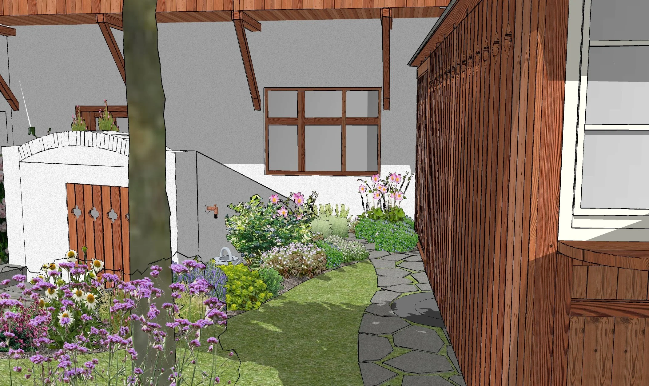 Malé zahrádky jsou příležitostí vyhrát si s detaily a tak tomu bylo i zde - na zahradě bývalé manufaktury na výrobu látek a nynějšího rodinného domu. Dům býval nejvýznamnější obytnou budovou v bývalé židovské čtvrti a v současnosti je citlivě rekonstruován v souladu s historickým rázem lokality. Zajímavostí je mimo jiné vstup do středověkého sklepa tvořící dominantu celé zahrady. Dostat do prostoru o rozměrech cca 100m2 vše potřebné včetně terasy, úložných prostor, záhonů a trávníku na fotbálek byla výzva, ale snad se to povedlo ke spokojenosti majitelů.